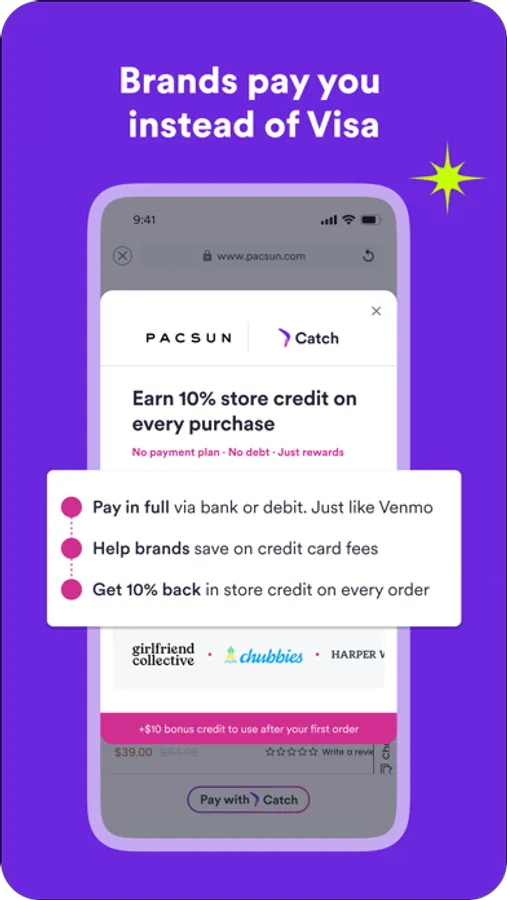 It’s a win-win for you and your favorite brands. When you pay with Catch, brands save on credit card fees and pass those savings to you. Everyone wins – except the credit card companies.