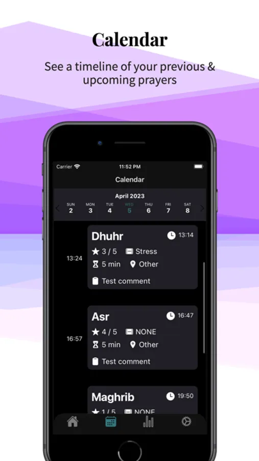 Whether you're at home or at the mosque, you can choose the location you prayed in, and our app will record it for you. You can also look at the calendar to see your past prayer logs and notes, and plan for future prayers.