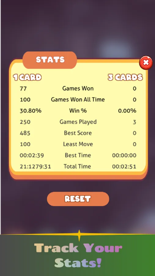 - Statistics; win %, score, time, games played, games won, etc.