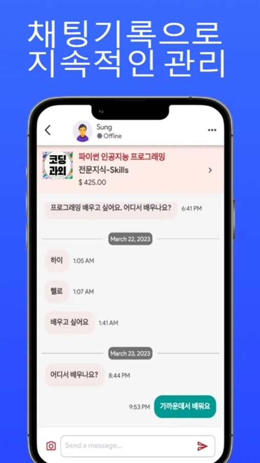 앱의 채팅기능을 통해 대화하고 튜터링을 시작할 수 있습니다.