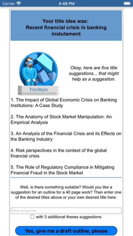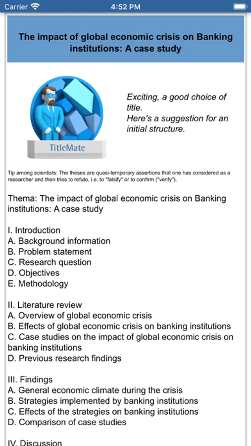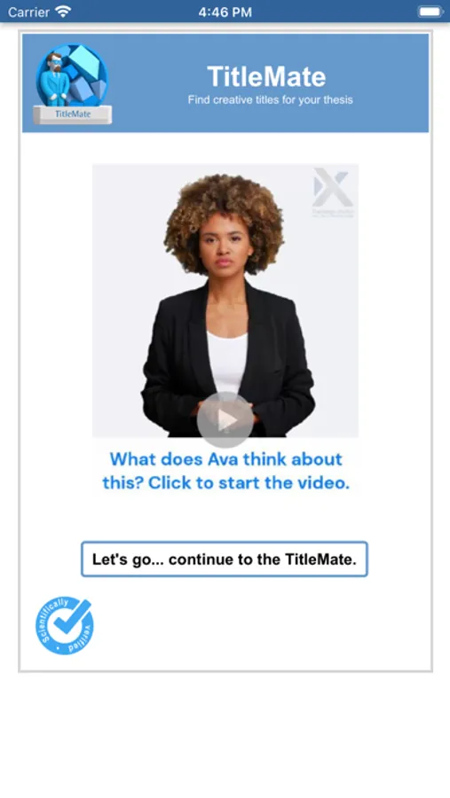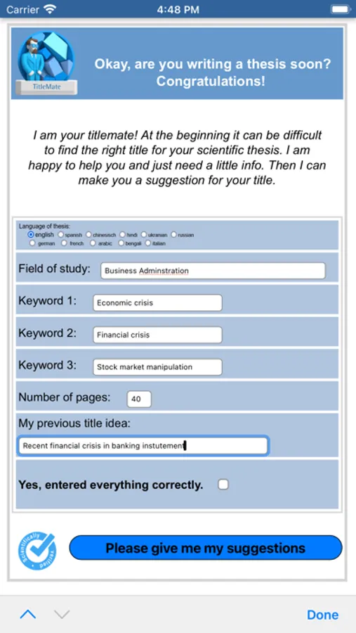This App is for university students and professors. It assists in finding a creative and good scientific title for e.g. a bachelor thesis or a final assignment. It is very easy to use.