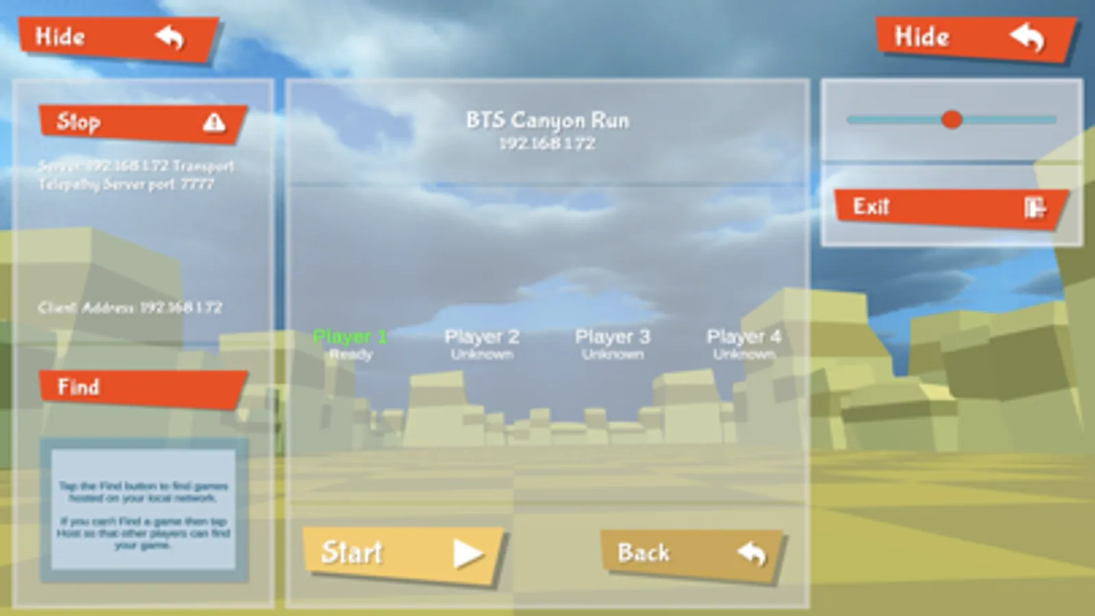 To play multiplayer, one player taps Host, other players tap Find and then join the game by tapping on the found server IP Address. All players tap Ready. The host taps Start.