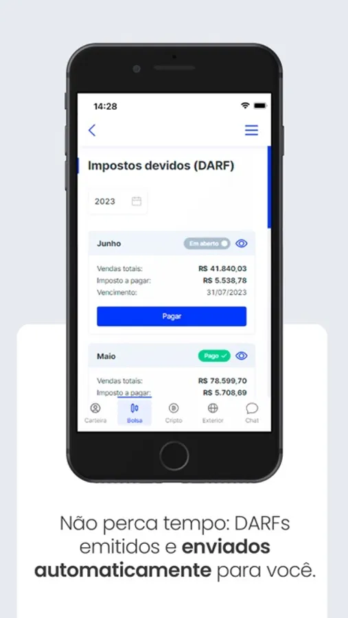 Nunca foi tão fácil investir! Pelo Velotax você tem acesso às vendas totais realizadas e o valor de imposto, quando devido. Chega de perder tempo: seus DARFs são emitidos e enviados para você automaticamente.