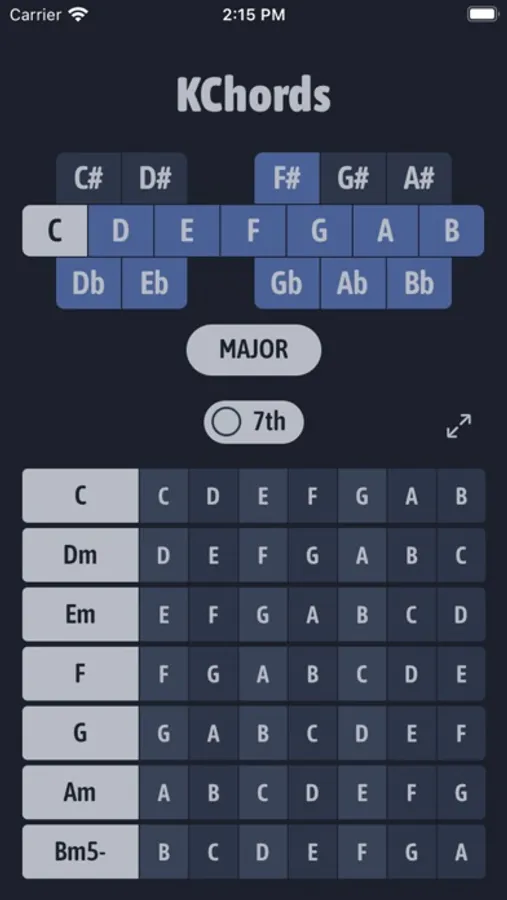 With KChords you can find the chords for any key, major or minor. You can also see the scale and the modes.
