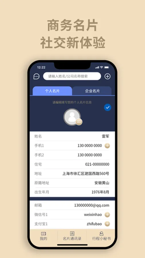 名片录是电子名片工具,用于在商务社交场合交换名片,帮助用户在线展示个人和公司形象,可以管理名片通讯录,对好友进行分组,方便快速地查找到名片资料,还有行程小秘书可以帮助用户管理个人行程,提醒您要办理的重要日程。可以分享名片给微信好友,获得更多的潜在客户。