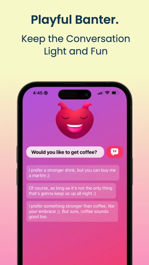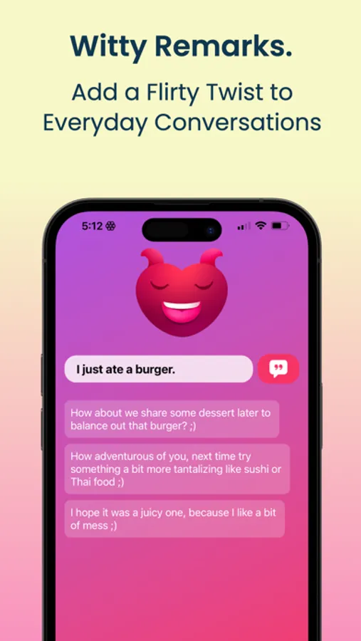 Introducing FlirtAI - your ultimate flirting assistant! Unleash your inner flirt and charm your way into captivating conversations with our innovative AI-powered app. Whether you're chatting with someone new on a dating app or spicing up a conversation with your partner, FlirtAI has got you covered.