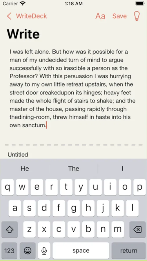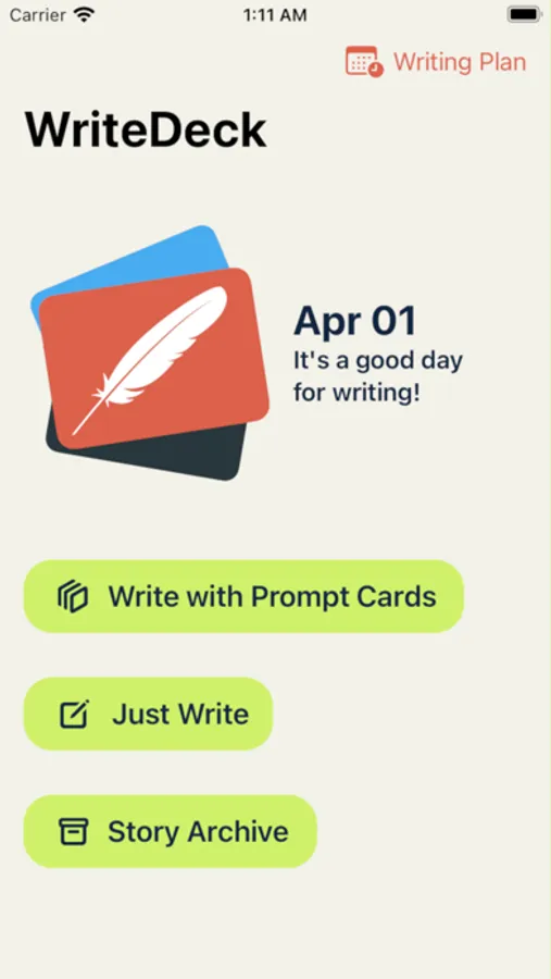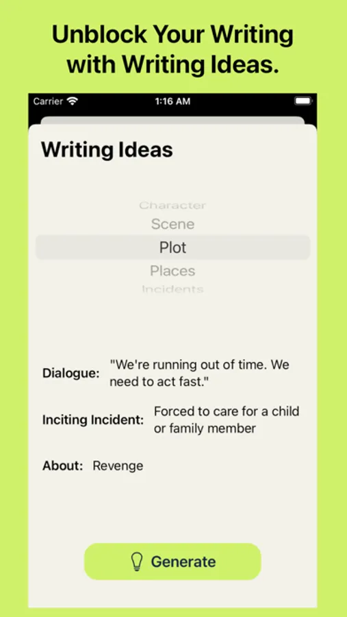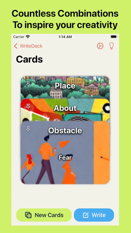 -Write with Cards: Utilize randomly generated cards from millions of different combinations to train your ability to quickly construct stories. With over 20 types of cards, including "Action," "Inciting Incidents" and "Dialogue," WriteDeck provides both freedom and training in controlling various genres. If you find a favorite card, you can use a pin to fix it in place, so you don't have to worry about the card refreshing.