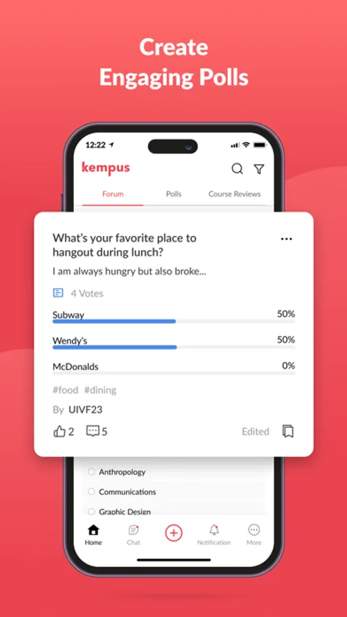 Embrace the Kempus revolution, an exclusive online community for students who value privacy, connection, and a richer university experience. Share your course reviews anonymously, create interesting polls, and dive deep into lively discussions that bring your campus closer. Kempus is your safe space to connect, share, and grow.
