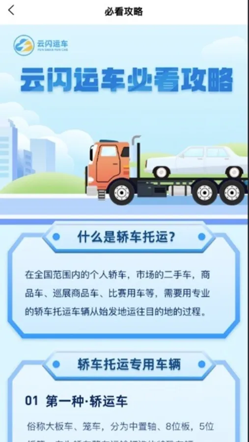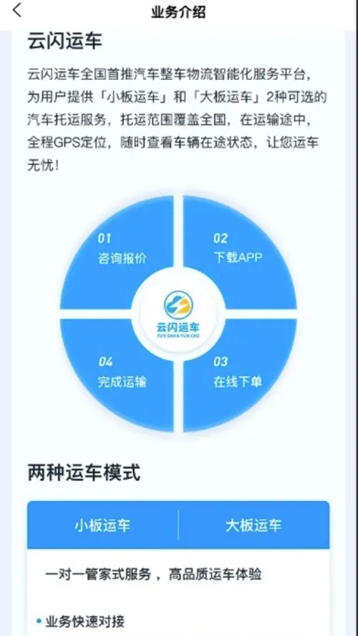 云闪运车,安全,高效,专业 云闪运,一款基于大数据和云计算的公路运输平台。 安全:通过云闪运车,实现干线运输安全、高效、透明。 高效:通过云闪运车,实现干线运输效率、成本下降20%;同时解决司机的疲劳驾驶问题