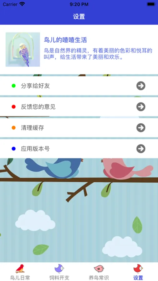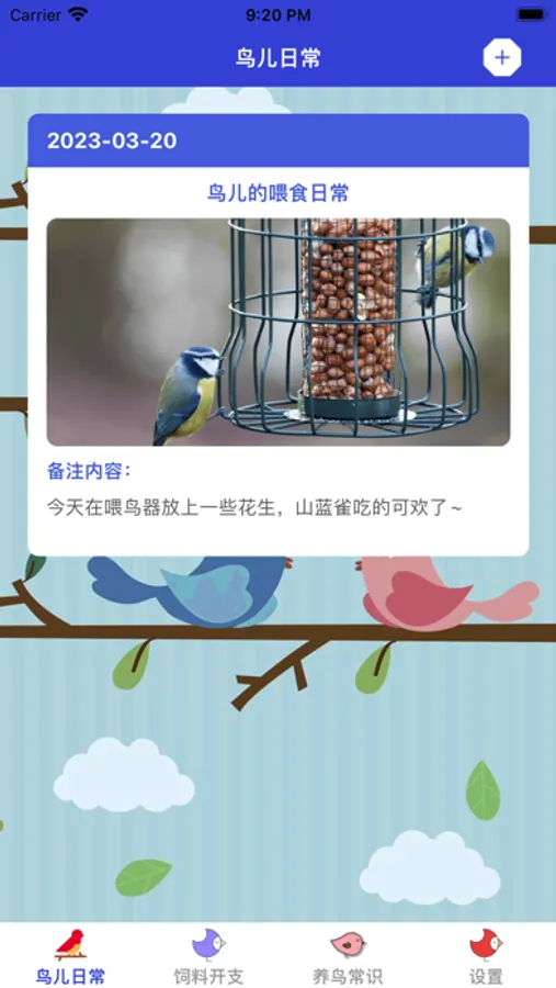 添加鸟儿的日常生活记录,统计饲料费用情况,推送养鸟常识和热门鸟舍。