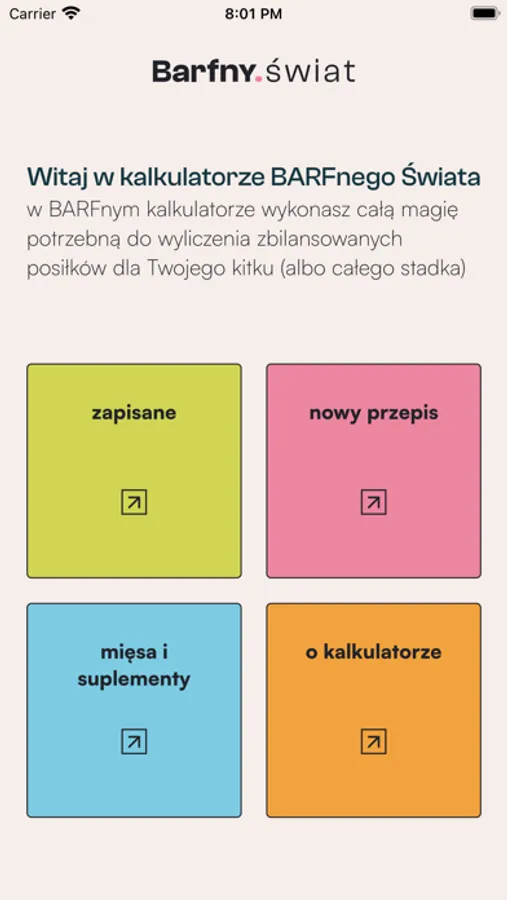 Jest to mobilna wersja BARFnego Kalkulatora dla kota, który można znaleźć na forum Barfnego Świata. Kalkulator pomaga właścicielom kotów w ułożeniu odpowiednio zbilansowanych przepisów diety BARF. W kalkulatorze można tworzyć przepisy, zapisywać je, edytować oraz dodawać własne mięsa i suplementy.