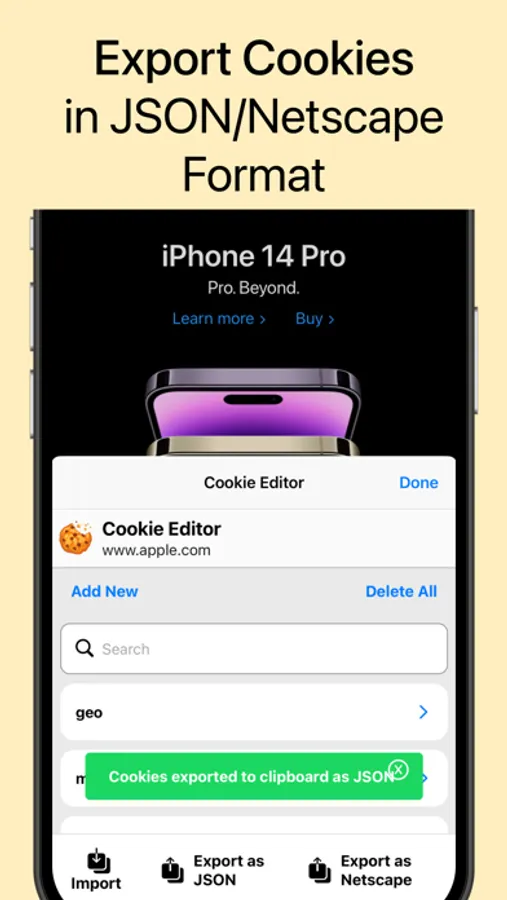 Our Cookie Editor provides you with the ability to thoroughly examine and edit the cookies of the current website in various ways. Not only can you create a new cookie manually, but you can also import text in JSON or Netscape format to make the process even easier. In addition, exporting cookies is made easy with the available options in JSON and Netscape format. If you're searching for a specific cookie, you can easily find it using the intuitive search function. And if you're looking to clear your cookies, you can do so with just one click, providing an efficient way to manage your cookies. Overall, managing cookies with our Cookie Editor is not only simple and straightforward, but also provides a wealth of options to ensure complete control over your online experience.