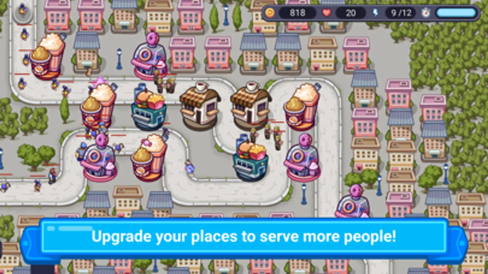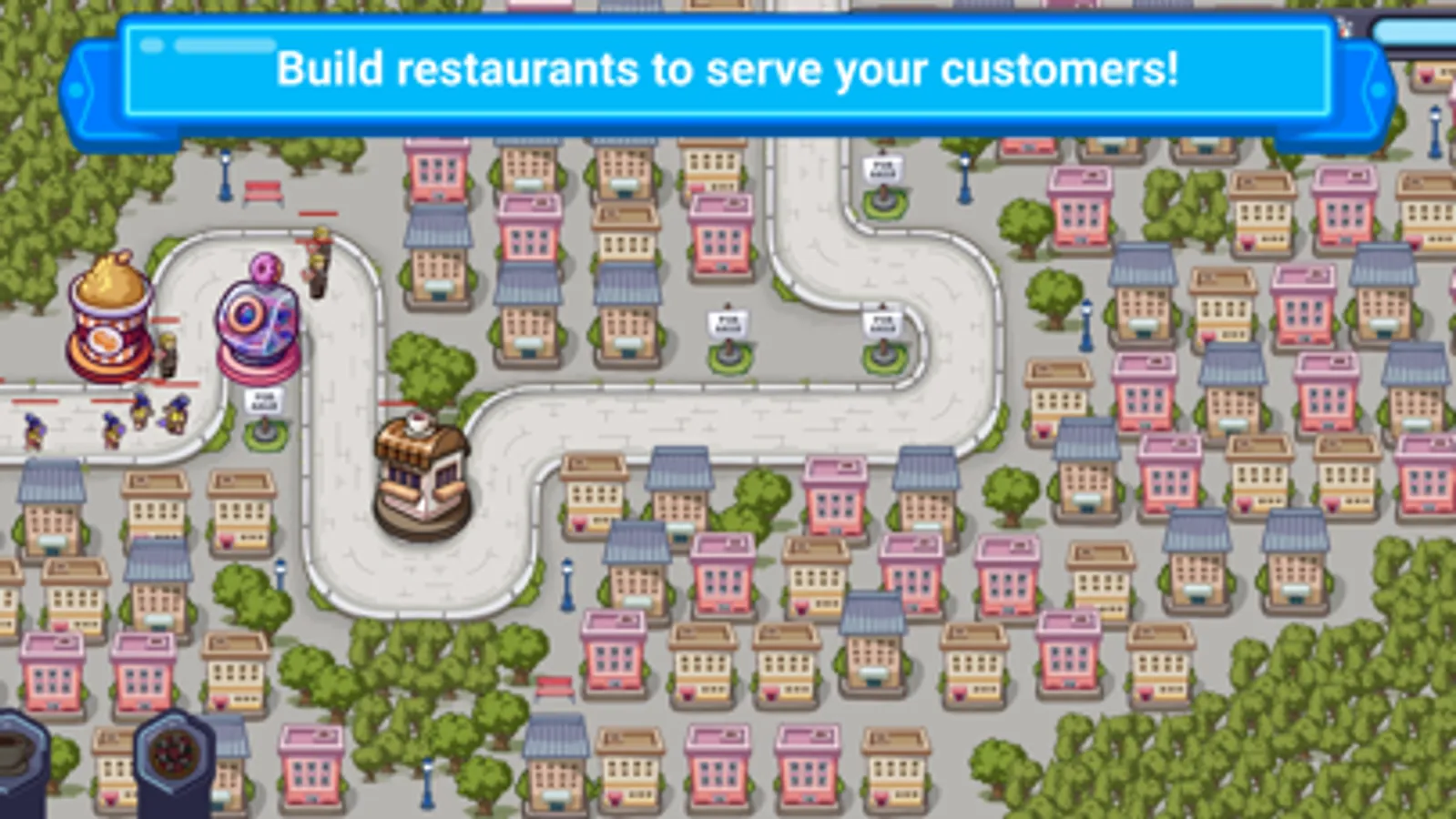 Each restaurant you choose to defend has its own strengths and weaknesses. Some are fast food joints, perfect for quickly serving up burgers and fries to hungry customers, while others are high-end candy shops where you can offer exquisite sweets and treats. Coffee points may serve delicious coffee outside, forcing customers to stop for a drink, a nice way of slowing the wave down.