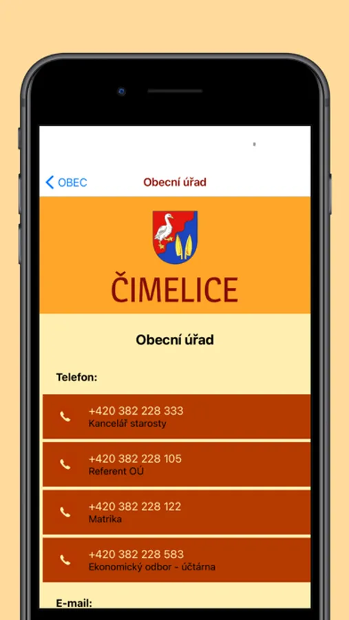 Aplikace obce Čimelice obsahuje důležité informace o obci. Najdete v ní potřebné kontakty, aktuality a co se v obci děje. V aplikaci naleznete také nezbytné odkazy, úřední hodiny obecního úřadu, ale i kam se vydat za kulturou a sportem. Aplikace nabízí kontaktní formulář, rychlé psaní e-mailu či snadné volání.