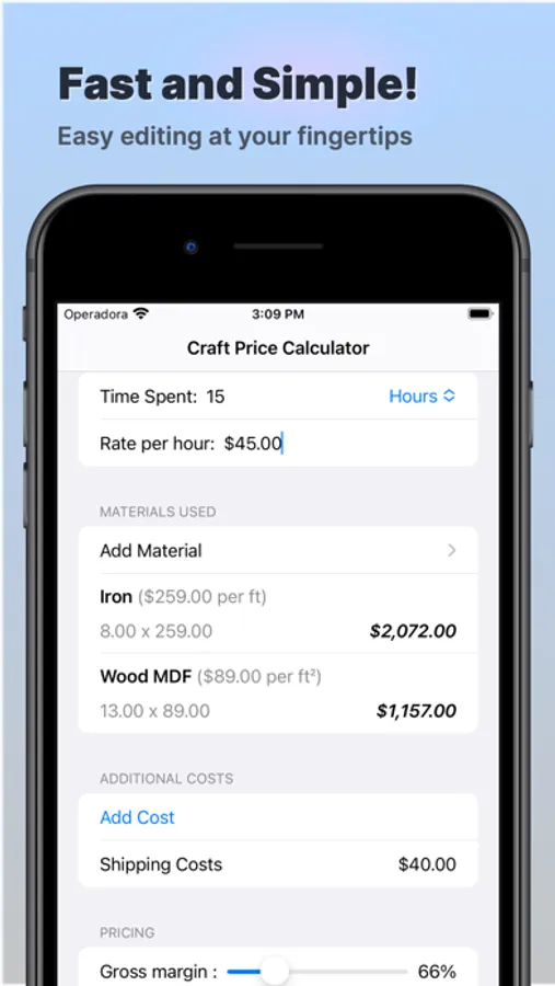Introducing the ultimate tool for artisans and crafters! With our iOS app, you can easily calculate the pricing cost for your creative projects with just a few taps.