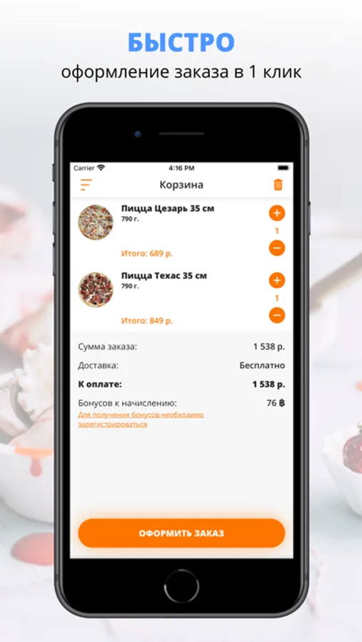 Установите приложение, выберите любимые блюда из нашего меню и оформите заказ всего в несколько кликов! С помощью мобильного приложения сможете получать и копить бонусы, отслеживать статус заказа, выбрать удобный способ оплаты и быть в курсе всех акций и новостей!