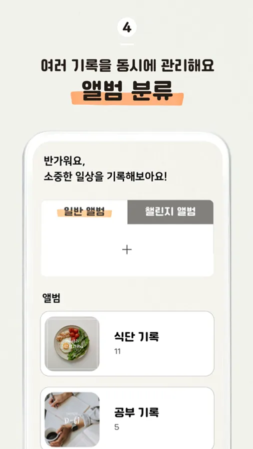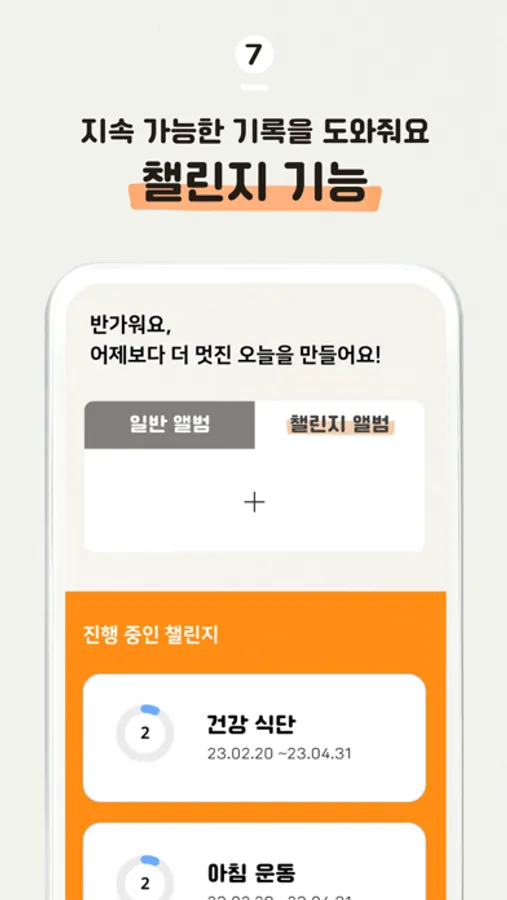 - 챌린지 앨범 설정을 통해 기록을 지속할 수 있도록 도와줘요!
