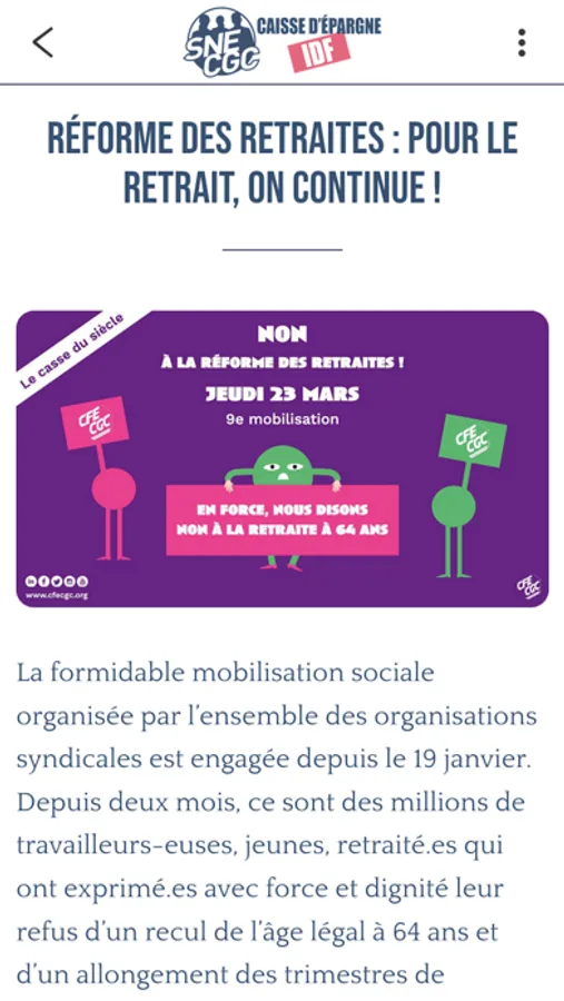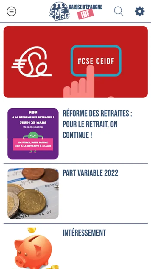 Dans cette application, retrouvez facilement toute l’actualité, nos tracts et toutes les informations liées au dialogue social au sein de la Caisse d’Epargne IDF et du groupe Caisse d’Epargne.