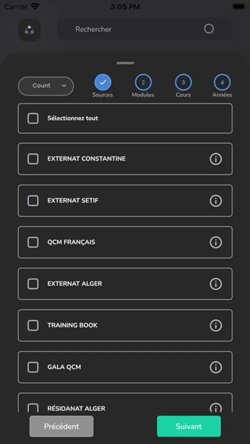 • Contenant plus de 130 mille QCMs: de différentes sources, des différentes Wilayas aussi que des sources françaises, classés par année, module et cours respectifs avec un Corrigé-type officiel et/ou proposé par les majeurs.