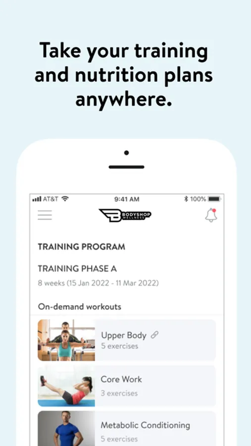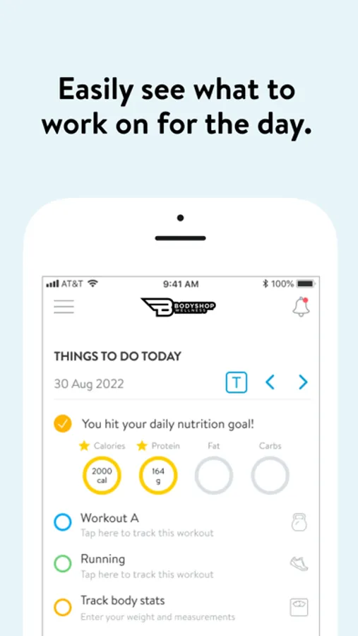With the Bodyshop Wellness App, you will have access to workout programs designed specifically to help you reach your fitness and health goals! You can follow & track your workouts, your nutrition, your lifestyle habits, measurements and results–all with the help of your coach.
