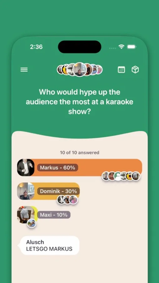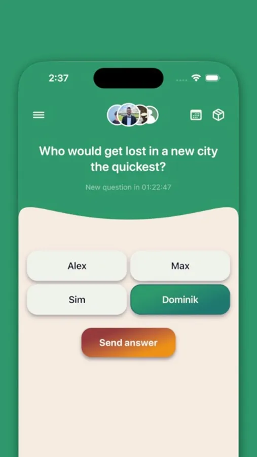 Spice up your group chats with AskUs, the ultimate friend-poll app! Answer thought-provoking daily questions or polls about your friends, then vote and see the results for endless entertainment. Perfect for groups of 3 or more. Connect, laugh, and bond over newfound insights into each other's personalities and quirks.