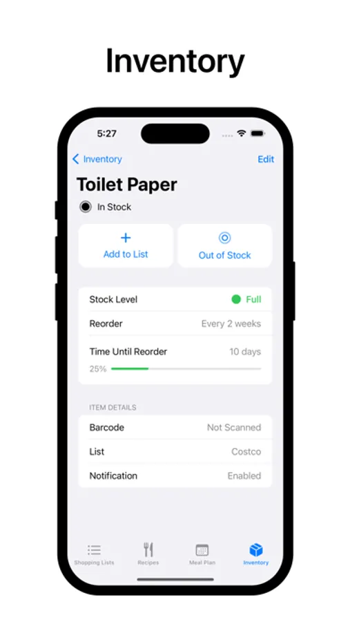 Keep track of reordering items and stock levels and reduce food waste by only buying what you need. Set a reorder period for items used regularly and automatically add them to your shopping list. Scan an item’s barcode to find it again easily.