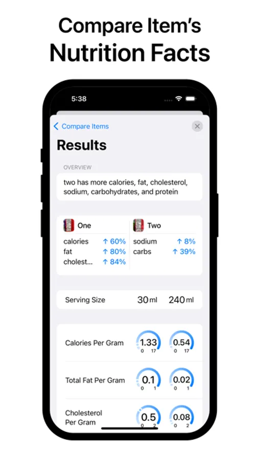 Scan two items’ nutrition labels to compare them. View differences in calories, fat, cholesterol, sodium, carbohydrates, and protein. Differences are expressed in amount per gram, taking into account each item’s serving size, to allow for easy comparison.