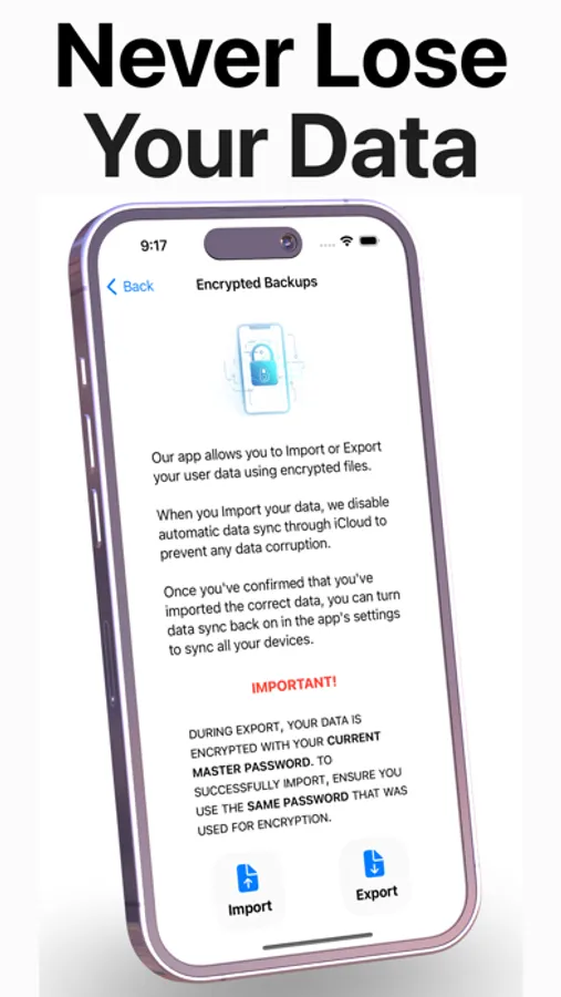 • Import/Export Encrypted Backups – Create private, encrypted backups of your data and effortlessly import or export them to ensure your information is always safe and accessible.