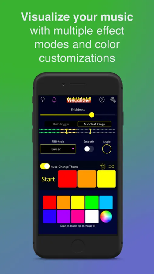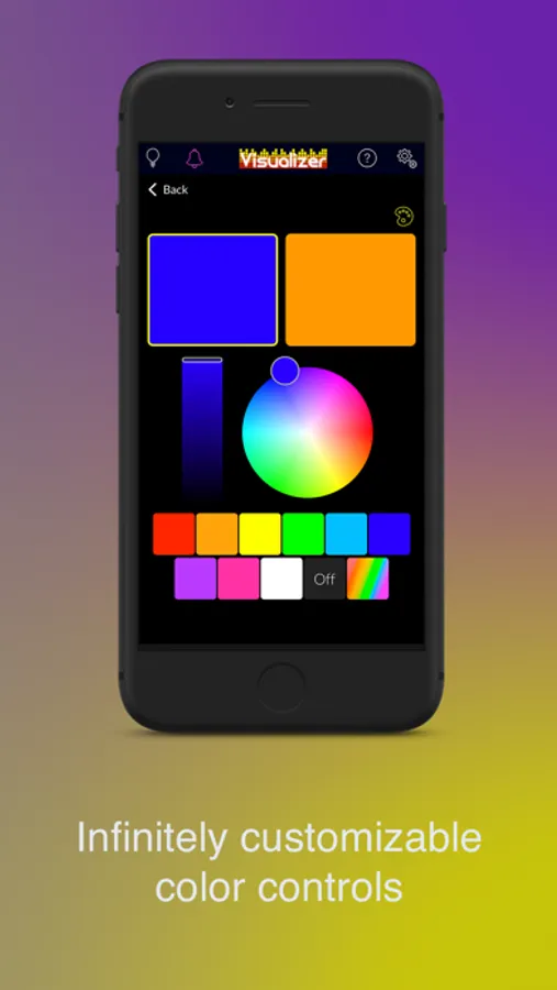 COLORS PALETTES: Create palettes of up to 8 colors and store them in the app. The Visualizer will pick colors from your selected palette at random to display on your bulbs and panels.