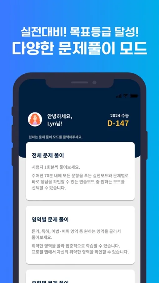 - 사용자의 편의에 따라 전체 문제 풀이, 영역별 문제 풀이, 유형별 문제 풀이 중 원하는 문제 풀이 모드를 선택할 수 있습니다.
