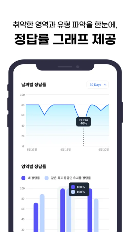 - 프로필 및 보고서 아이콘 클릭 시 날짜별 정답률, 유형별 정답률, 영역별 정답률 등을 그래프로 만들어 제공합니다.