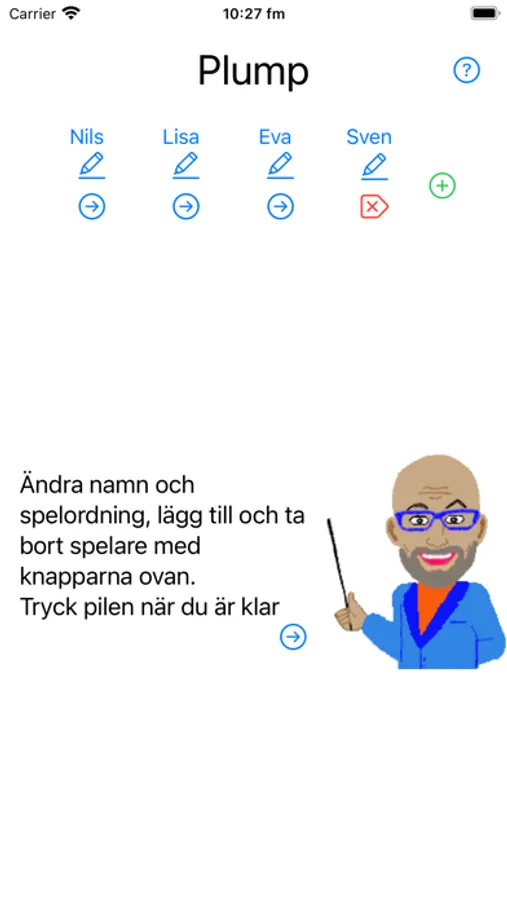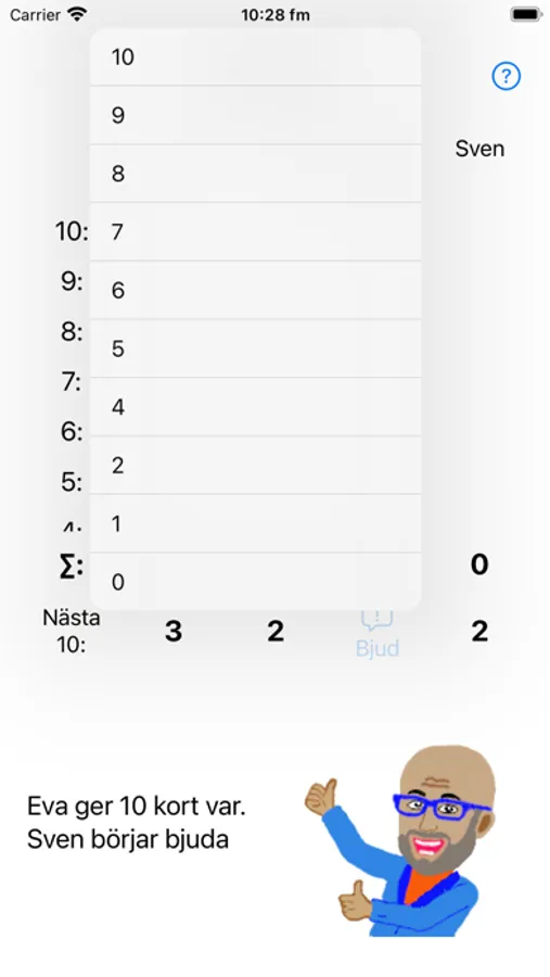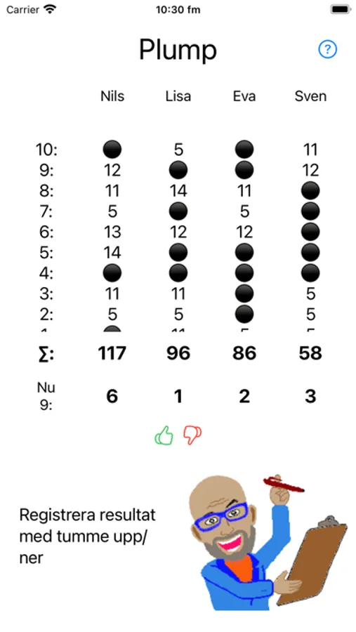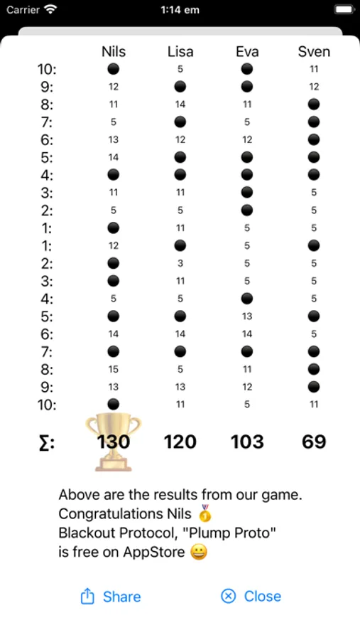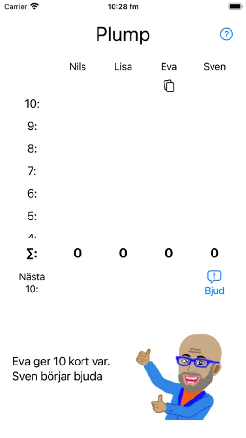 Plump Proto makes it easy to handle the protocol when you play Blackout. You register the bids, and when you have played the round, the points are distributed, which are continuously added up so that you can always see the total score. The app handles bidding limits and warns when something seems wrong based on the game's logic. All supported by instructive messages and illustrations. At the end of the game, you can easily share the result with the "share" function.