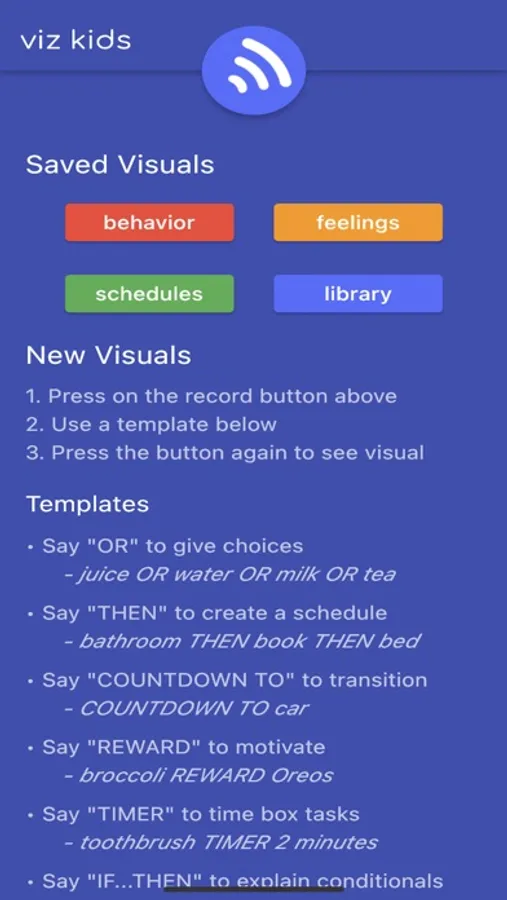 - See a list of common behavior visuals like listen, sit down, raise your hand, wait, share, etc. Tap on the one you want to show the child. You can also display a visual by simply recording yourself stating the specific behavior.