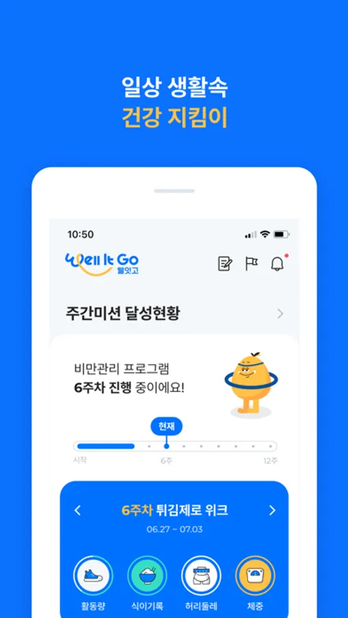 웰잇고는 사용자의 건강습관 형성을 위한 4가지 주간미션을 제공합니다.