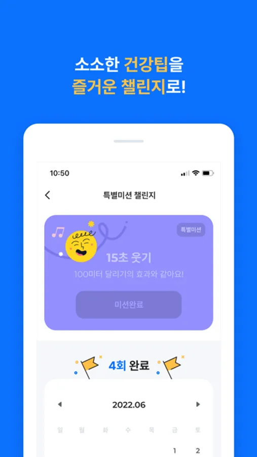 웰잇고는 매일매일 재미있는 특별미션을 전달하여 사용자에게 다양한 건강정보를 제공하고 실천을 독려합니다.