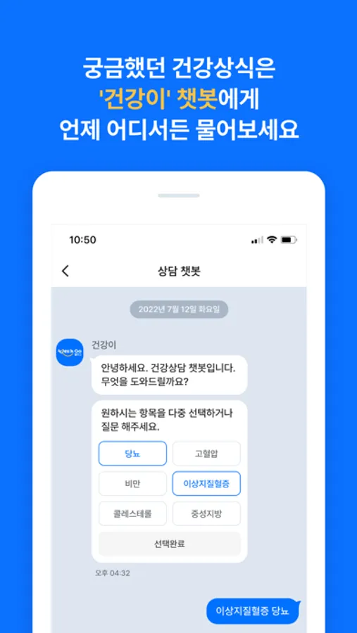 웰잇고는 궁금했던 대사증후군 관련 질환(고혈압/당뇨/이상지질혈증/비만)에 대한 건강정보를 건강이 AI상담 챗봇을 통해 언제 어디서든 (24/7) 제공합니다.
