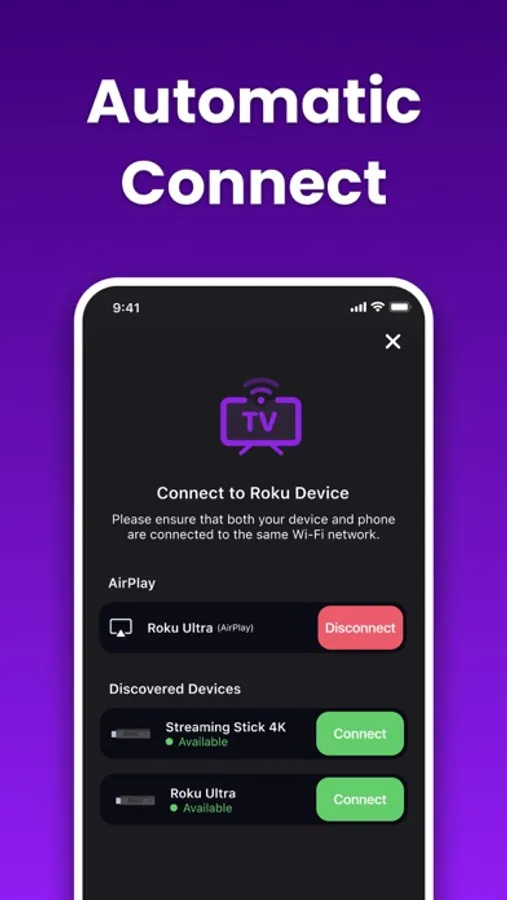 Simply connect your iPhone to the same Wi-Fi network as your smart TV and the app will automatically detect it. Then just click "connect" and you're all set.