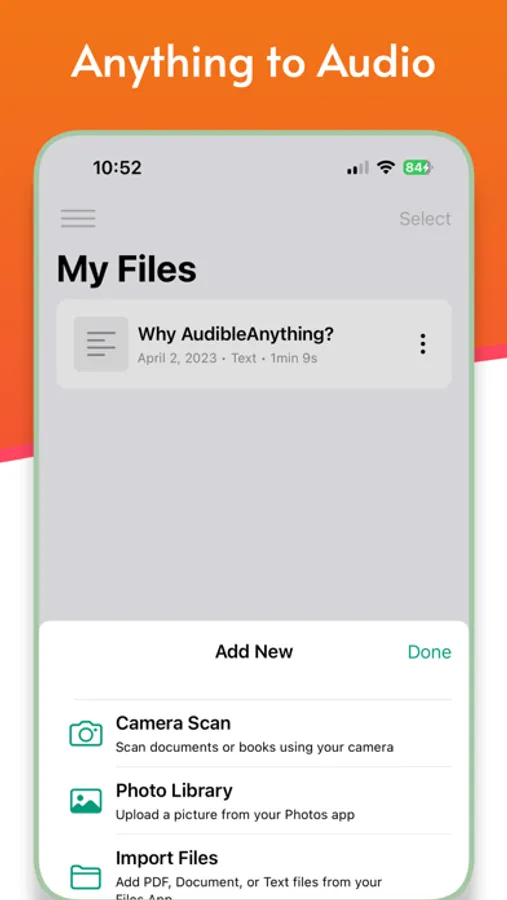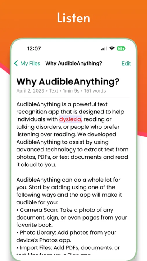 AudibleAnything is a top ranking app for text to speech. Empowering individuals with dyslexia and other reading & speaking disorders around the globe, AudibleAnything can converting any text from images, PDFs, and documents into audio. With just a few taps, you can capture an image or select a file from your phone, and our advanced text recognition technology will automatically convert the text into high-quality audio that you can listen to on the go.