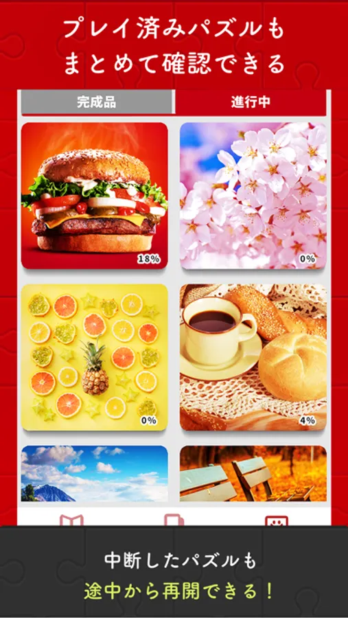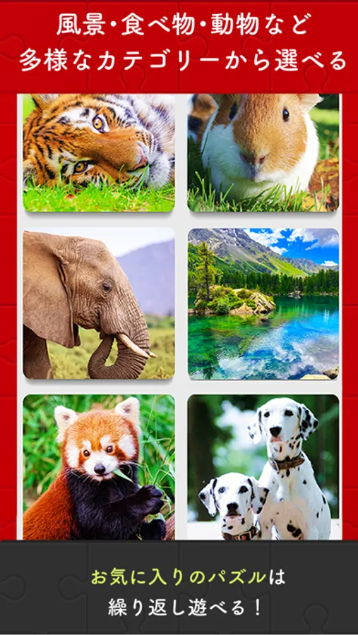 You can enjoy beautiful jigsaw puzzles in a variety of categories including popular landscapes, nature, food, animals, cats, dogs, and art.