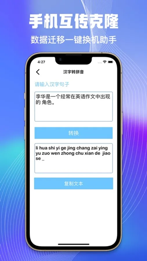 这是一款非常好用的数据转移助手,手机文件互传,一键传输,方便快捷,还有文本检测、汉字转拼音等功能,等你体验!