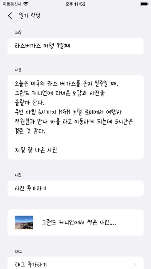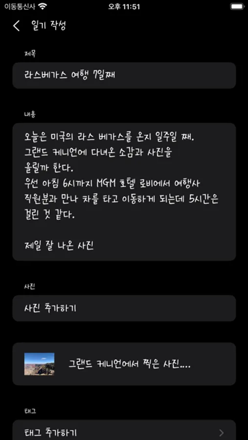 - 일기에 사진을 추가하여 사진에 대한 설명과 정보를 입력할 수 있어요.