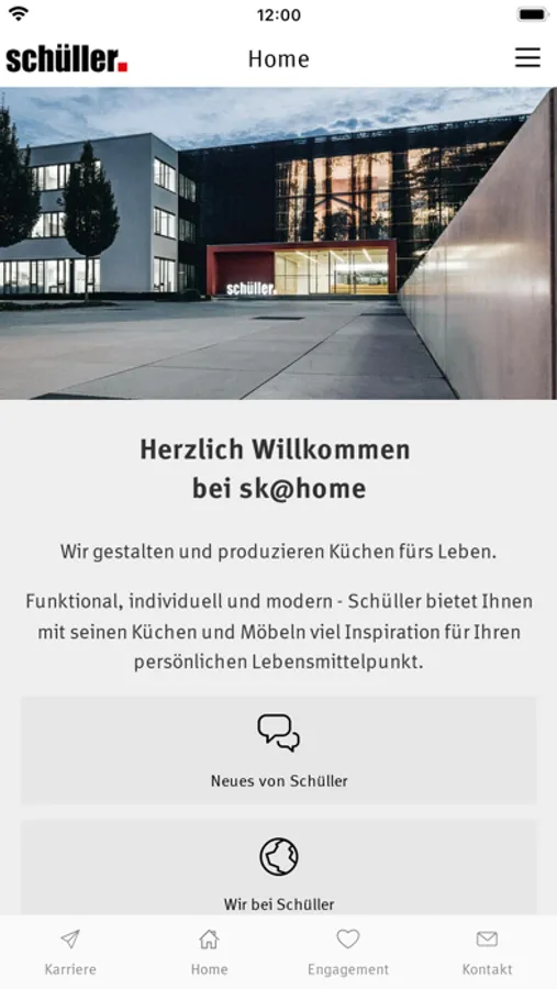 sk@home ist die App der Schüller Möbelwerk KG und bietet Neuigkeiten, Stellenangebote und Informationen rund um das Unternehmen für Partner, Kunden, Mitarbeitende und Interessierte.