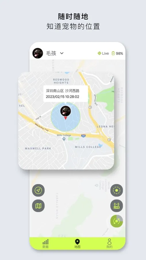 1.通过绑定智能硬件在宠物身上,可在地图页面实时定位宠物的位置;