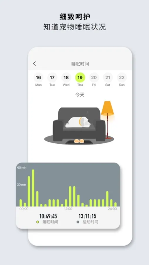 3.通过智能硬件传感器,统计宠物运动量数据、睡眠数据,帮助用户了解宠物的健康状况。