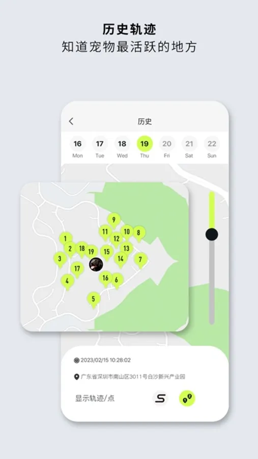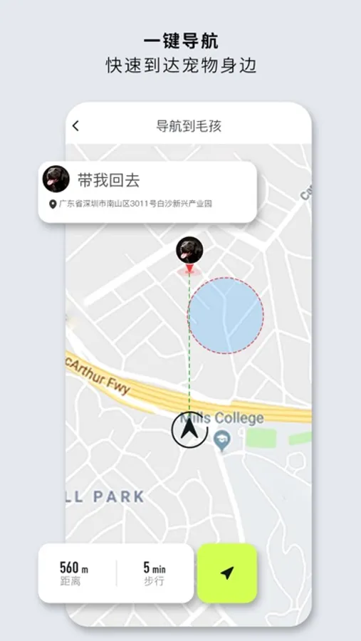 2.通过电子虚拟围栏设定,可以在宠物越过虚拟围栏时及时提示用户,防水宠物丢失;
