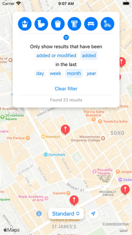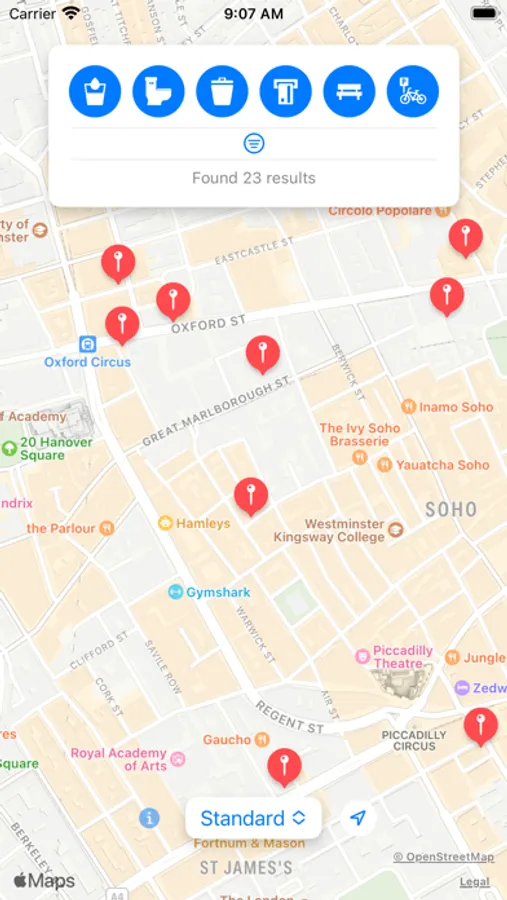 • Find - Search for Toilets, Benches, Drinking water, Bins, Bike parking, ATMs.