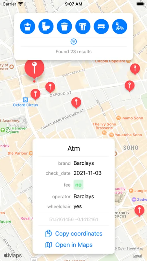 • Explore - See a card with details about a selected results - for example whether a Toilet or ATM charges a fee, whether a bike rack is covered