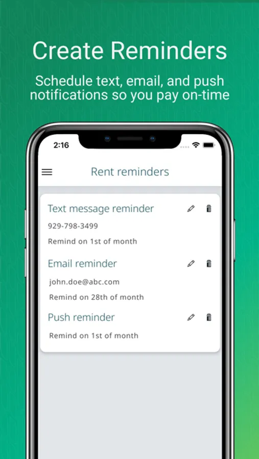 • Reminders: Configure a schedule of push notifications and text and email reminders to help you pay on time