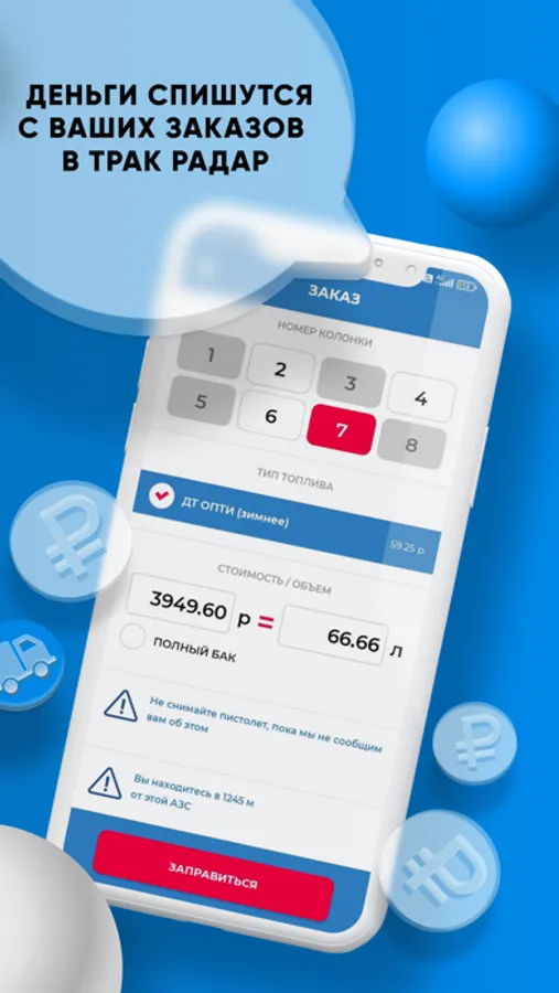 Оплачивайте топливо с телефона - за счет рейсов, которые выполняете через "Трак Радар". Приложение позволяет заправляться в рассрочку без переплат: деньги спишем из будущих заказов через наш сервис.