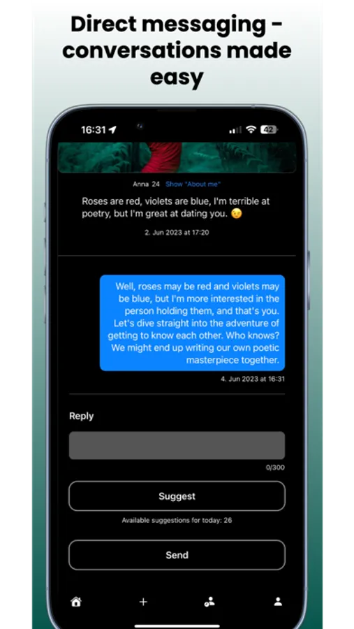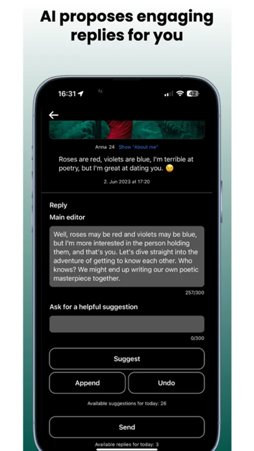 The nifty AI Cupid is on hand to craft your perfect message. It studies your intended's "About Me" and their previous messages, creating a context-aware response. And you can sprinkle your personal touch before it flies off to your crush.
